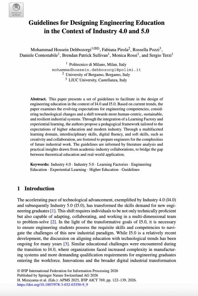 Το παρόν έγγραφο παρουσιάζει ένα σύνολο κατευθυντήριων γραμμών για τη διευκόλυνση του σχεδιασμού της εκπαίδευσης στη μηχανική στο πλαίσιο των I4.0 και I5.0. Με βάση τις τρέχουσες τάσεις, το έγγραφο εξετάζει τις εξελισσόμενες προσδοκίες για τις ικανότητες μηχανικής, τις τεχνολογικές αλλαγές και τη στροφή προς πιο ανθρωποκεντρικά, βιώσιμα και ανθεκτικά βιομηχανικά συστήματα. Μέσω της ενσωμάτωσης ενός Εργαστηρίου Μάθησης και της εμπειρικής μάθησης, οι συντάκτες προτείνουν ένα παιδαγωγικό πλαίσιο προσαρμοσμένο στις προσδοκίες της τριτοβάθμιας εκπαίδευσης και της σύγχρονης βιομηχανίας. Μέσω ενός πολύπλευρου μαθησιακού τομέα, προωθούνται οι διεπιστημονικές δεξιότητες, η ψηφιακή ευχέρεια και οι μη τεχνικές δεξιότητες, όπως η δημιουργικότητα και η συνεργασία, ώστε να προετοιμαστούν οι μηχανικοί για την πολυπλοκότητα των μελλοντικών βιομηχανικών εργασιών. Οι κατευθυντήριες γραμμές βασίζονται σε βιβλιογραφική ανάλυση και πρακτικές πληροφορίες που αντλούνται από συνεργασίες ακαδημαϊκής βιομηχανίας, προκειμένου να γεφυρωθεί το χάσμα μεταξύ της θεωρητικής εκπαίδευσης και της εφαρμογής σε πραγματικές συνθήκες.