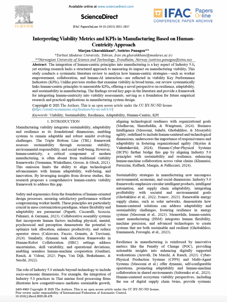 Η ενσωμάτωση ανθρωποκεντρικών αρχών στη μεταποίηση αποτελεί βασική πτυχή της Βιομηχανίας 5.0, ωστόσο η υφιστάμενη έρευνα δεν διαθέτει δομημένη προσέγγιση για τη μέτρηση του αντικτύπου της στη βιωσιμότητα της μεταποίησης. Η παρούσα μελέτη διενεργεί συστηματική ανασκόπηση της βιβλιογραφίας για να αναλύσει τον τρόπο με τον οποίο οι ανθρωποκεντρικές στρατηγικές — όπως η ενδυνάμωση των εργαζομένων, η συνεργασία και η αλληλεπίδραση ανθρώπου-ΤΝ — αντικατοπτρίζονται στους βασικούς δείκτες επιδόσεων (ΒΔΕ) βιωσιμότητας. Σε αντίθεση με προηγούμενες μελέτες που εξετάζουν τη βιωσιμότητα σε γενικές γραμμές, η επισκόπησή μας συνδέει συστηματικά τις ανθρωποκεντρικές αρχές με μετρήσιμους ΒΔΕ, προσφέροντας μια νέα προοπτική όσον αφορά την ανθεκτικότητα, την προσαρμοστικότητα και τη βιωσιμότητα στον τομέα της μεταποίησης. Τα πορίσματα αποκαλύπτουν βασικά κενά στη βιβλιογραφία και παρέχουν ένα πλαίσιο για την ενσωμάτωση της ανθρωποκεντρικής διάστασης στις αξιολογήσεις βιωσιμότητας, λειτουργώντας ως βάση για τη μελλοντική εμπειρική έρευνα και τις πρακτικές εφαρμογές στον σχεδιασμό συστημάτων παραγωγής.