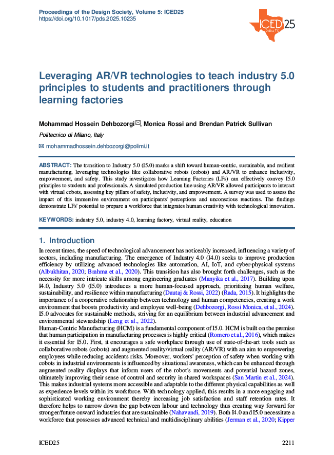 Η μετάβαση στη Βιομηχανία 5.0 (I5.0) σηματοδοτεί μια στροφή προς την ανθρωποκεντρική, βιώσιμη και ανθεκτική μεταποίηση, αξιοποιώντας τεχνολογίες όπως τα συνεργατικά ρομπότ (cobot) και η AR/VR για την ενίσχυση της συμπεριληπτικότητας, της ενδυνάμωσης και της ασφάλειας. Η μελέτη αυτή διερευνά τον τρόπο με τον οποίο τα Εργοστάσια Μάθησης (LF) μπορούν να μεταφέρουν αποτελεσματικά τις αρχές της I5.0 σε σπουδαστές και επαγγελματίες. Μια προσομοιωμένη γραμμή παραγωγής με τη χρήση AR/VR έδωσε στους συμμετέχοντες τη δυνατότητα να αλληλεπιδρούν με εικονικά cobot, αξιολογώντας βασικούς πυλώνες ασφάλειας, συμπεριληπτικότητας και ενδυνάμωσης. Χρησιμοποιήθηκε έρευνα για την αξιολόγηση του αντικτύπου αυτού του περιβάλλοντος εμβύθισης στις αντιλήψεις και τις ασυνείδητες αντιδράσεις των συμμετεχόντων. Τα πορίσματα καταδεικνύουν τη δυνατότητα των LF να προετοιμάσουν ένα εργατικό δυναμικό που ενσωματώνει την ανθρώπινη δημιουργικότητα στην τεχνολογική καινοτομία.